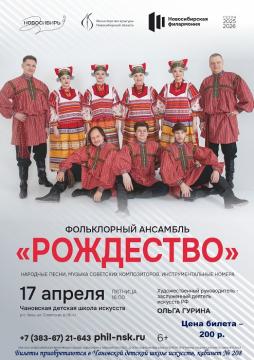 Приглашаем вас на уникальный концерт, который состоится 17 апреля в 16:00 в стенах Чановской детской школы искусств. В этот день к нам приедет замечательный коллектив – фольклорный ансамбль "Рождество" Новосибирской Филармонии!
